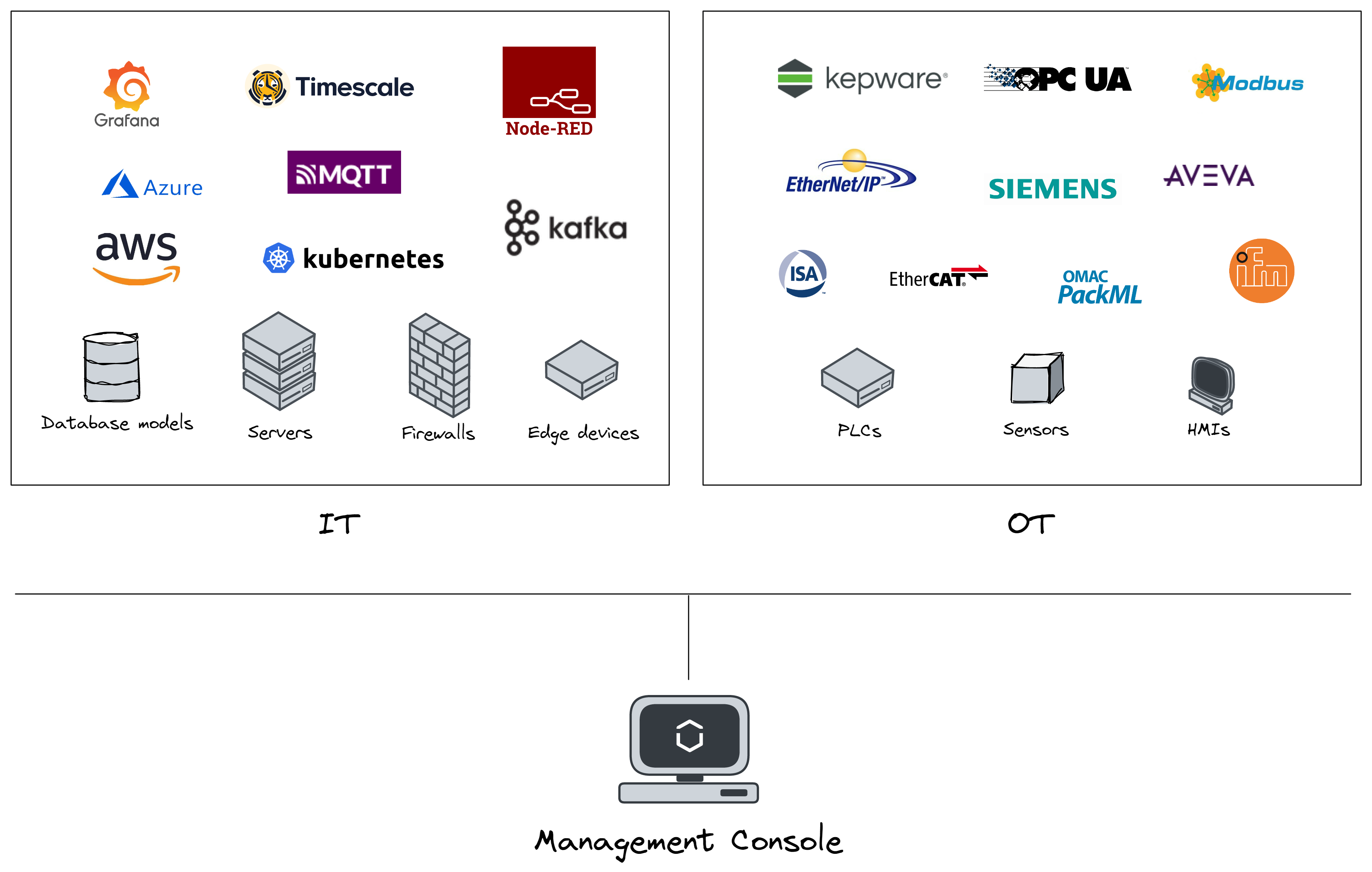 With our commercial Management Console you can manage your entire IT / OT infrastructure and work with Grafana / Node-RED without the need to ever touch or understand Kubernetes, Docker, Firewalls, Networking or similar.